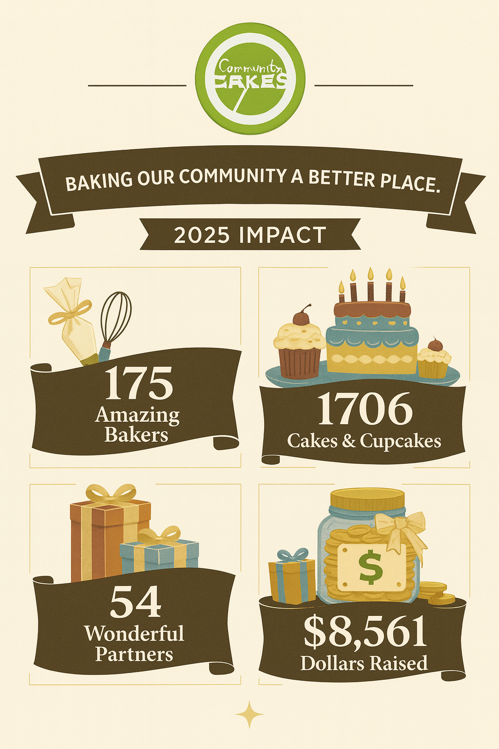 Community Cakes is a 501(c)3 non-profit organization of volunteers that gives the gift of a homemade birthday cake to people in our community who otherwise would not receive one.